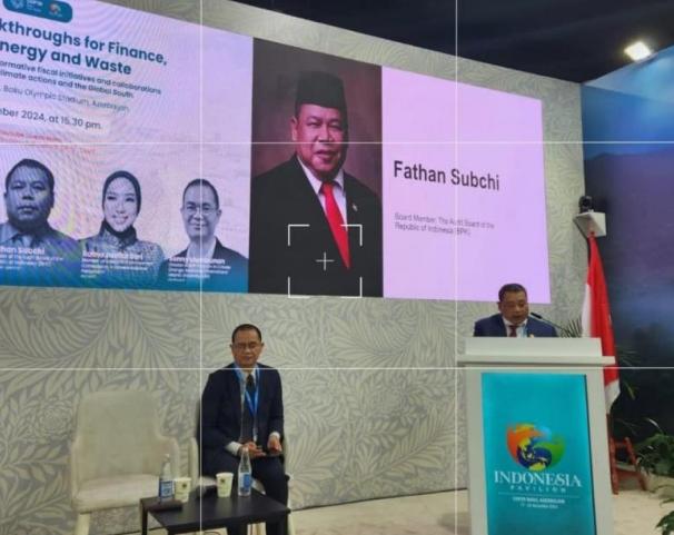 Berbicara di Paviliun Indonesia, Anggota VI BPK, Fathan Subchi, menyoroti kebijakan transformasi fiskal Indonesia yang progresif dalam mendukung upaya mitigasi dan adaptasi perubahan iklim.