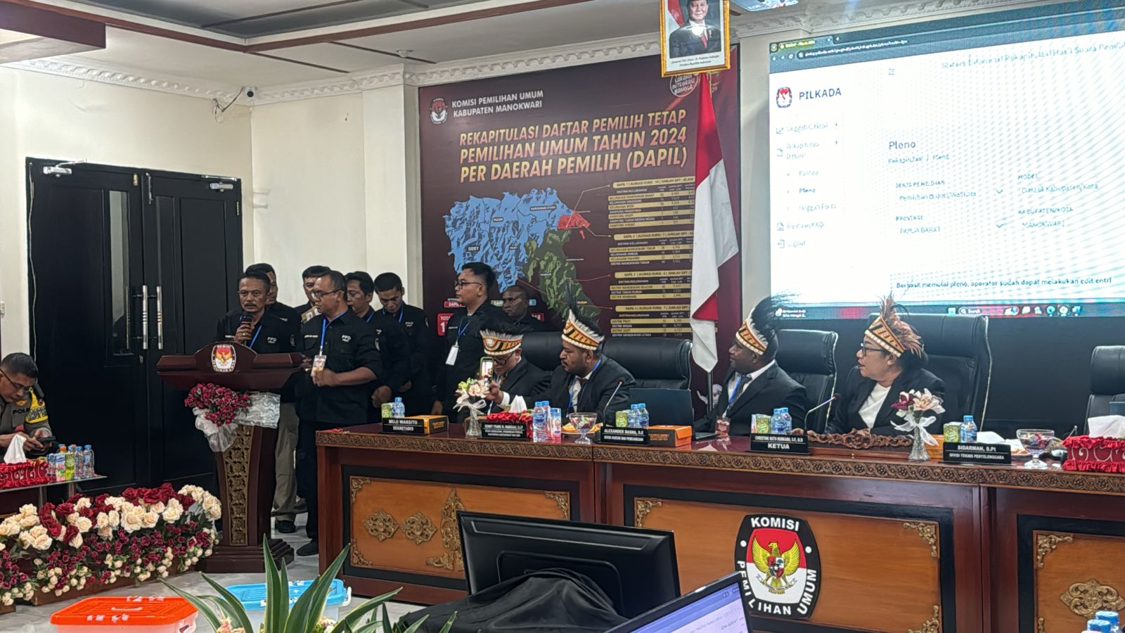 Manokwari, SURYA ARFAK – Sebanyak dua distrik telah menyampaikan hasil rekapitulasi penghitungan suara Pemilihan Bupati dan Wakil Bupati Manokwari pada Rapat Pleno Terbuka Rekapitulasi Hasil Penghitungan Suara Tingkat Kabupaten Manokwari tahun 2024, Jumat (6/12/2024).