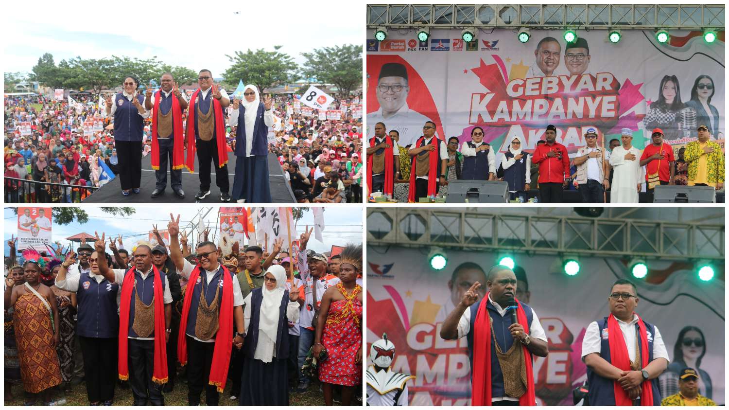 Manokwari, SURYA ARFAK – Ribuan massa memadati lapangan Aimasi, SP-3, distrik Prafi, untuk mengikuti kampanye pasangan Hermus Indou dan Mugiyono (HERO), Rabu (20/11/2024).