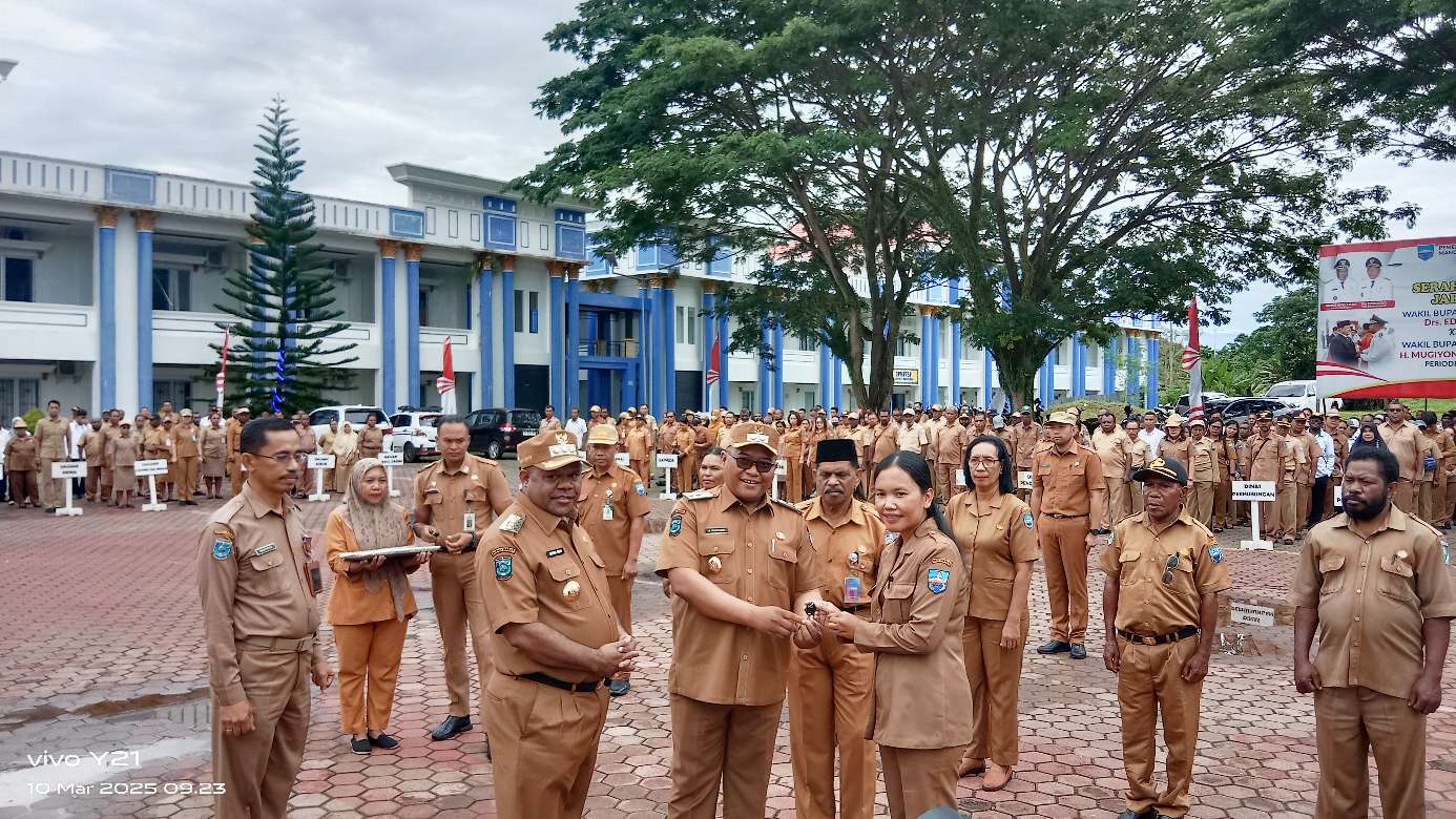 Manokwari, SURYA ARFAK – Bupati Manokwari, Hermus Indou, memimpin apel perdana di halaman kantor Bupati Manokwari, Senin (10/3/2025). Pada kesempatan itu, Hermus didampingi Wakil Bupati Mugiyono menyerahkan secara simbolis kendaraan roda dua kepada 10 Puskesmas.
