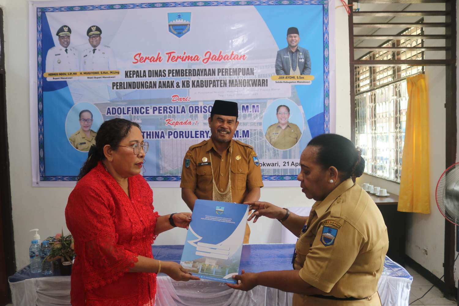 MANOKWARI, SURYA ARFAK – Jabatan Kepala Dinas Pemberdayaan Perempuan, Perlindungan Anak, dan KB (DP3AKB) Kabupaten Manokwari resmi diserahterimakan dari pejabat lama Adolfince P. Orisoe kepada pejabat baru Alberthina Porulery, Selasa (21/4/2026). Serah terima jabatan tersebut dipimpin oleh Sekretaris Daerah (Sekda) Manokwari, Yan Ayomi.