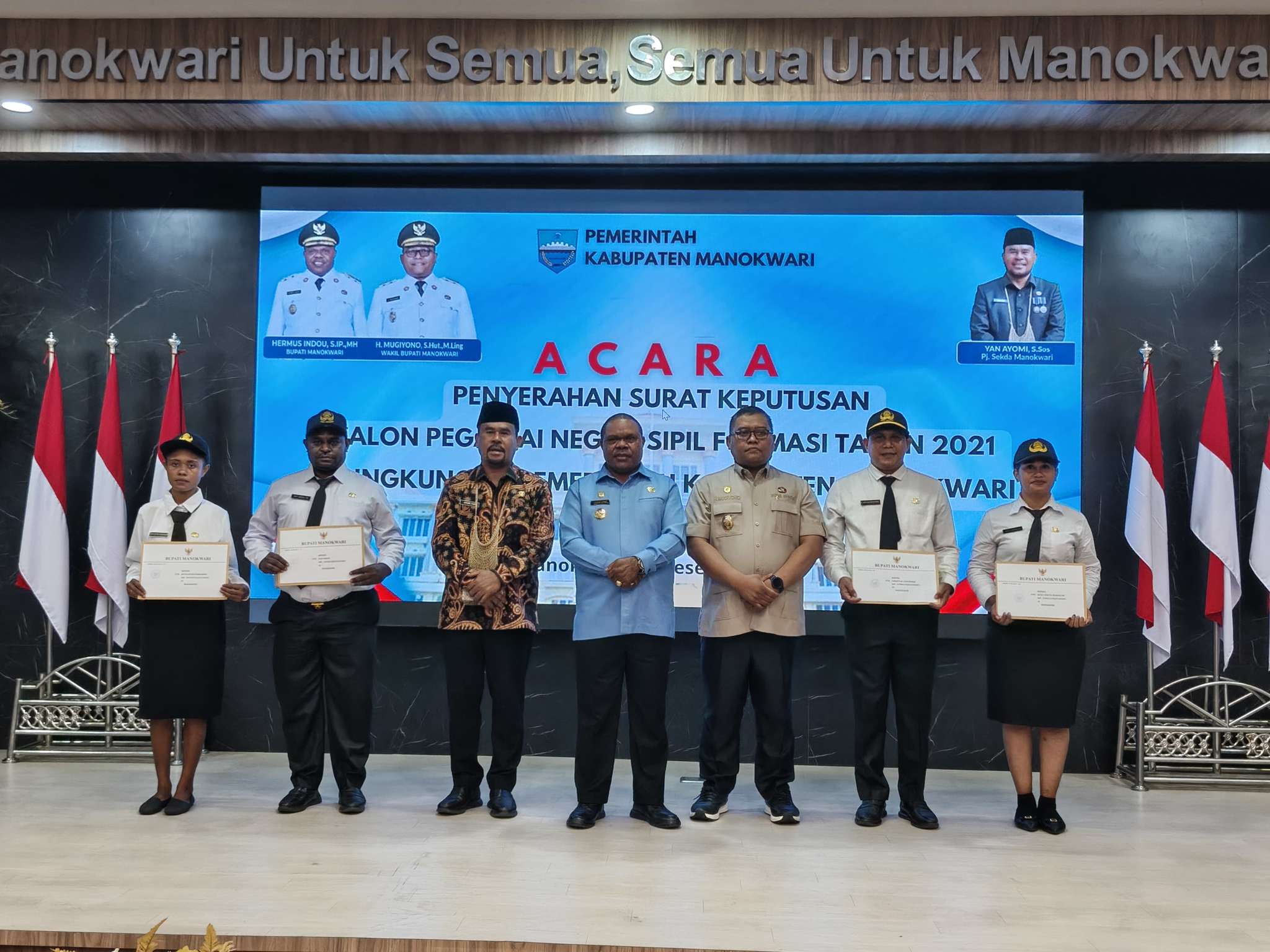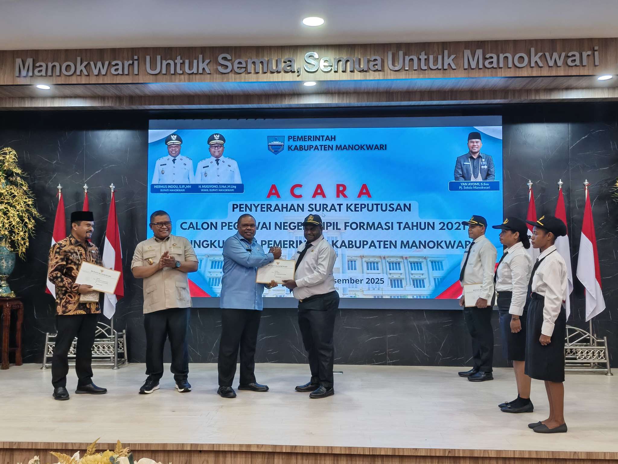 MANOKWARI, SURYA ARFAK – Bupati Manokwari, Hermus Indou, menyerahkan Surat Keputusan (SK) pengangkatan kepada 308 Calon Pegawai Negeri Sipil (CPNS) Kabupaten Manokwari formasi tahun 2021. Penyerahan SK berlangsung di Ruang Sasana Karya, Kantor Bupati Manokwari, Jumat (19/12/2025).