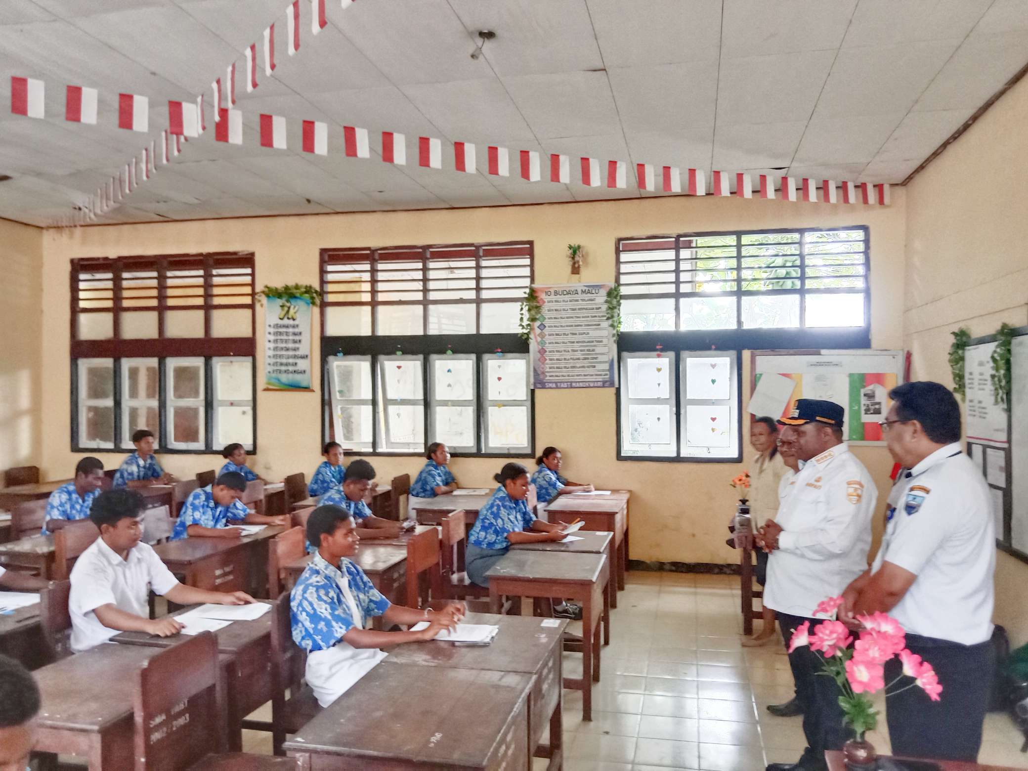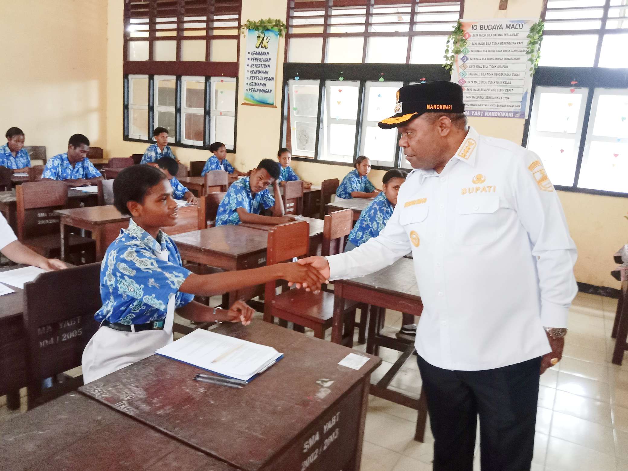 Manokwari, SURYA ARFAK – Bupati Manokwari, Hermus Indou, memantau pelaksanaan ujian akhir sekolah (UAS) tingkat SMA di SMAN 1, SMAN 2, dan SMAN Yayasan Anu Beta Tubat (YABT) Manokwari, Rabu (9/4/2025).
