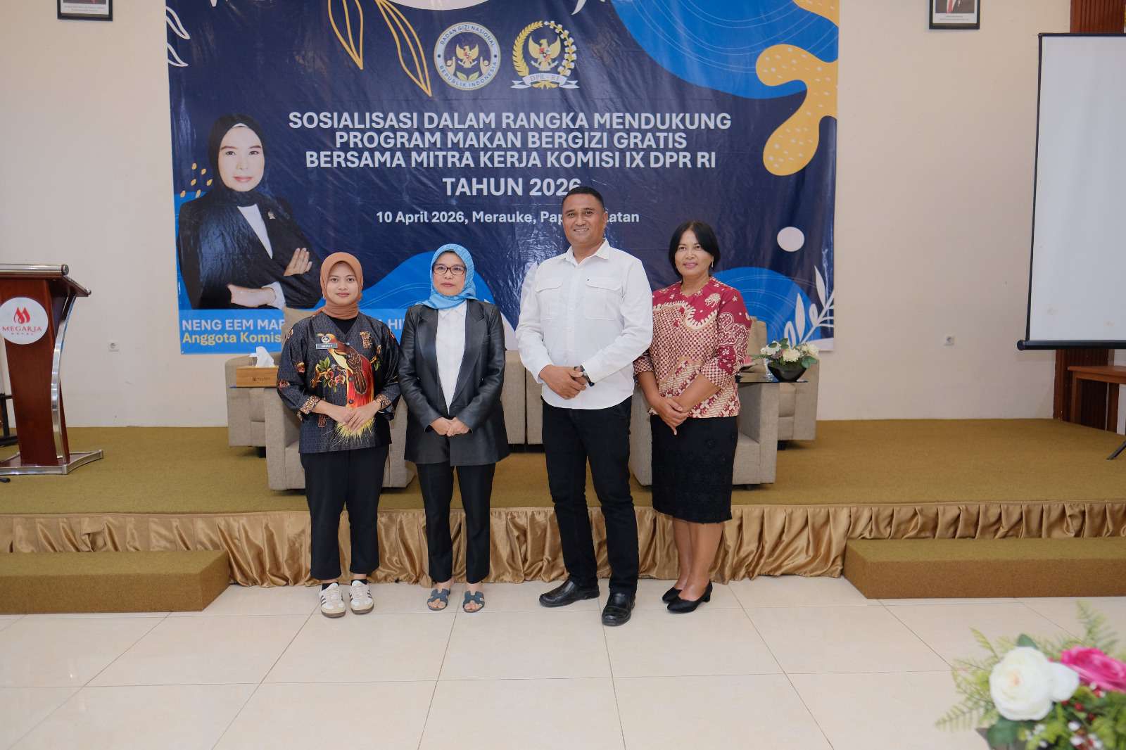 MERAUKE, SURYA ARFAK – Sosialisasi Program Makan Bergizi Gratis (MBG) bersama mitra kerja sukses diselenggarakan di Aula Megaria Hotel, Kota Merauke, Provinsi Papua Selatan, Jumat (10/4/2026). Kegiatan ini menghadirkan berbagai pemangku kepentingan, mulai dari anggota DPR RI, tenaga ahli, perwakilan Badan Gizi Nasional, hingga tokoh masyarakat.