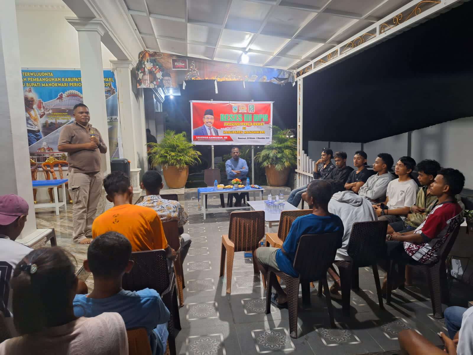 MANOKWARI, SURYA ARFAK – Anggota DPR Papua Barat, Xaverius Kameubun, SH, menyerap aspirasi masyarakat, mahasiswa, dan pemuda saat melakukan reses di Manokwari. Dalam pertemuan tersebut, sejumlah persoalan diangkat warga, mulai dari kemacetan akibat antrean BBM di Jalan Esau Sesa, hingga menyusutnya lahan pertanian dan persoalan perhutanan sosial di wilayah Manokwari.